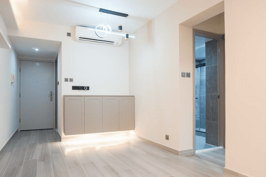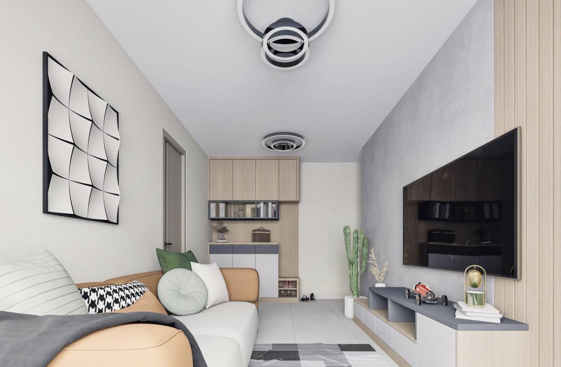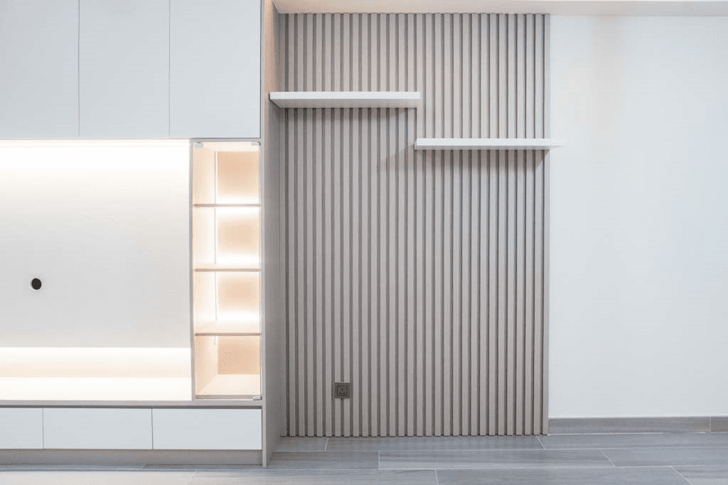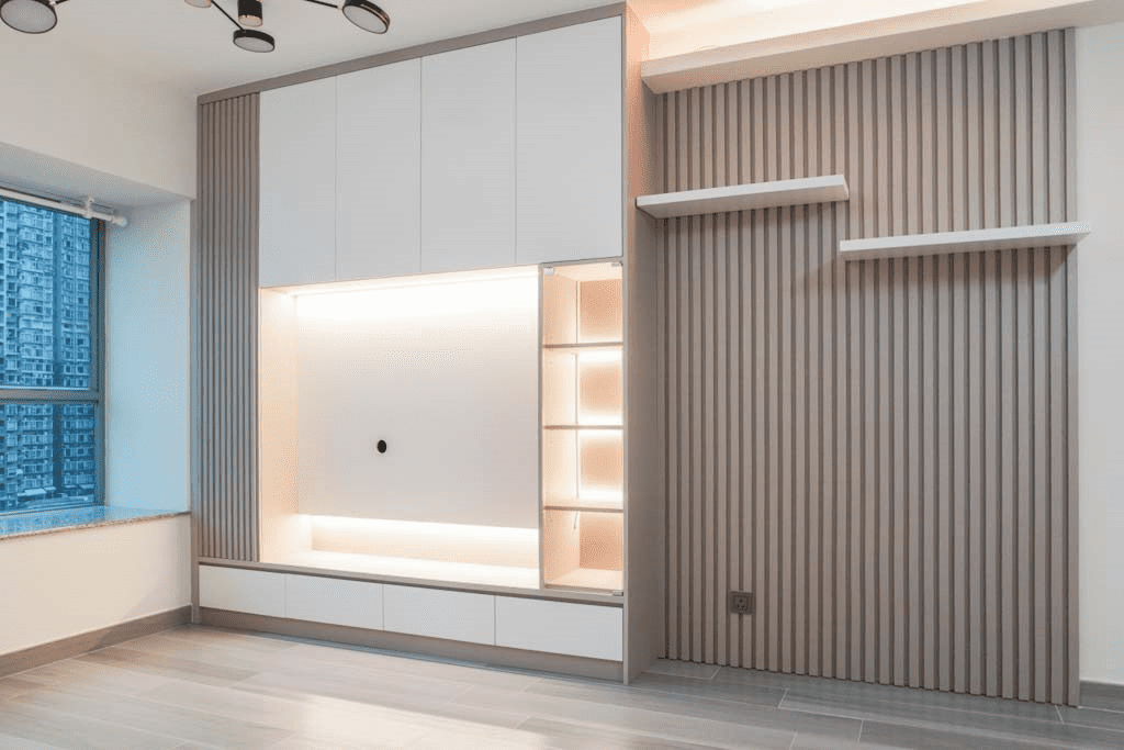 今次分享的單位融入了奶油風的設計元素。客廳內訂製一組到頂電視櫃,顏色選用奶茶啡與純白色互相配搭,櫃內暗藏燈帶營造滲燈效果;屋主想在電視櫃旁放置鋼琴,為了不讓鋼琴背景牆觀感過於單調,延續電視櫃的條子紋設計,選用同色系條子製作特色背景牆,整體呈現奶油風簡潔柔化空間輪廓的效果。