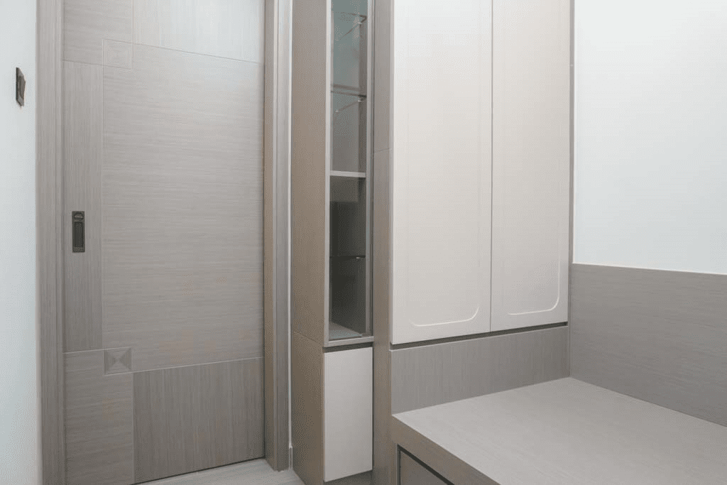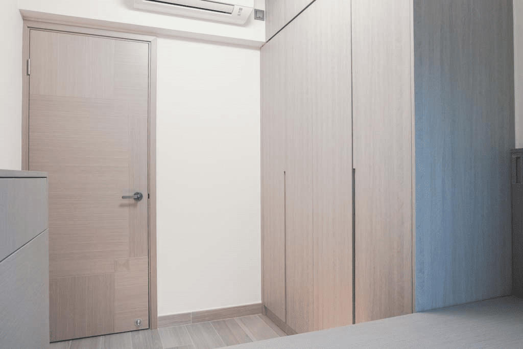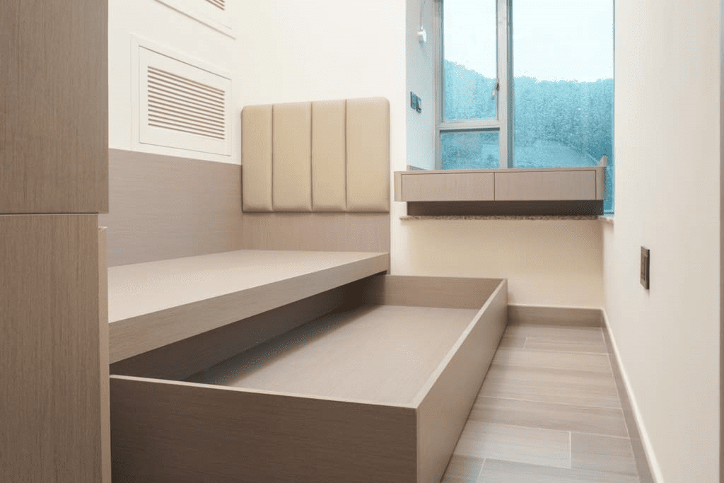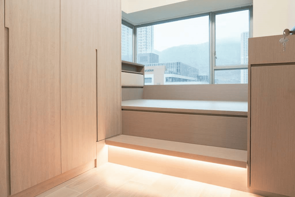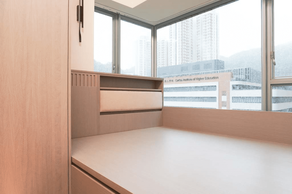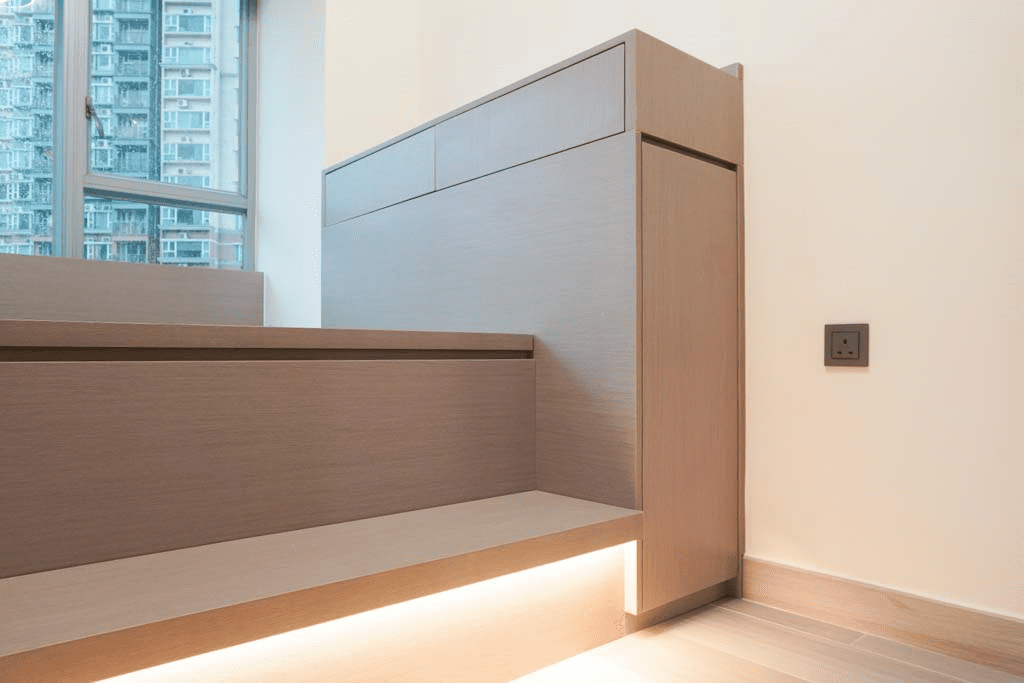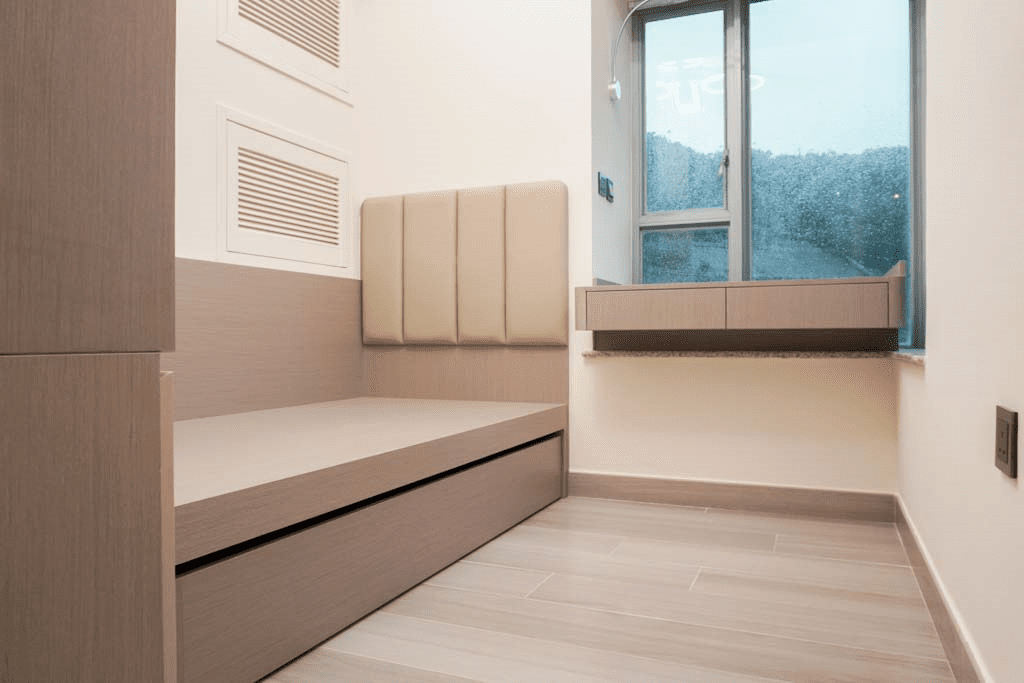 貫徹奶油風原木色彩,兩間睡房的傢俬均選用飽和度較低偏灰調的木系顏色。為了讓主人房空間增加,訂製雙人床架延伸至窗台位置,騰出更多地方,可於床邊訂製一組到頂高身衣櫃,整體設計大大提升房內的使用空間。另一間睡房則設有子母床,方便招待客人。同樣利用窗台位置,訂製一張合身的書枱,方便日常使用。不浪費任何位置,床尾位置設有一組衣櫃及小型書櫃,盡量發揮睡房內的有效空間。