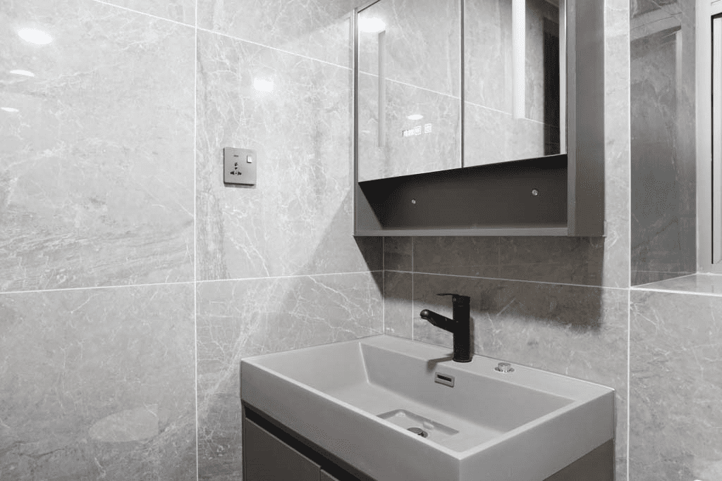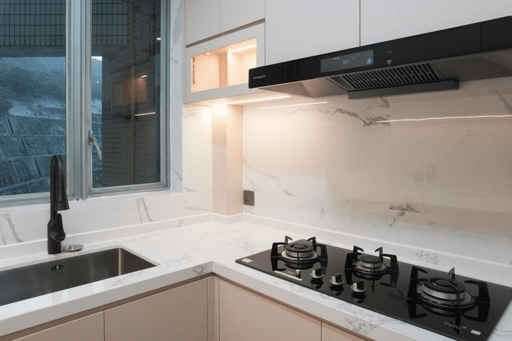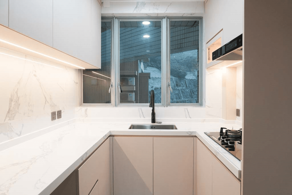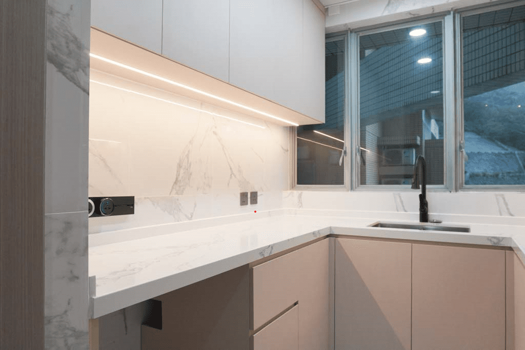 飯廳空間沒有放置多餘的傢俬,配合屋主的需要,以簡約線條設計一組離地餐邊櫃,櫃底設有燈光創造視覺空間感。掩門的弧形線條花紋,突顯奶油風溫軟柔和的感覺。廚房空間以純白色為主,奶白色廚櫃配襯雪白大理石紋牆身磚,給矛一種簡約乾淨的感覺。
