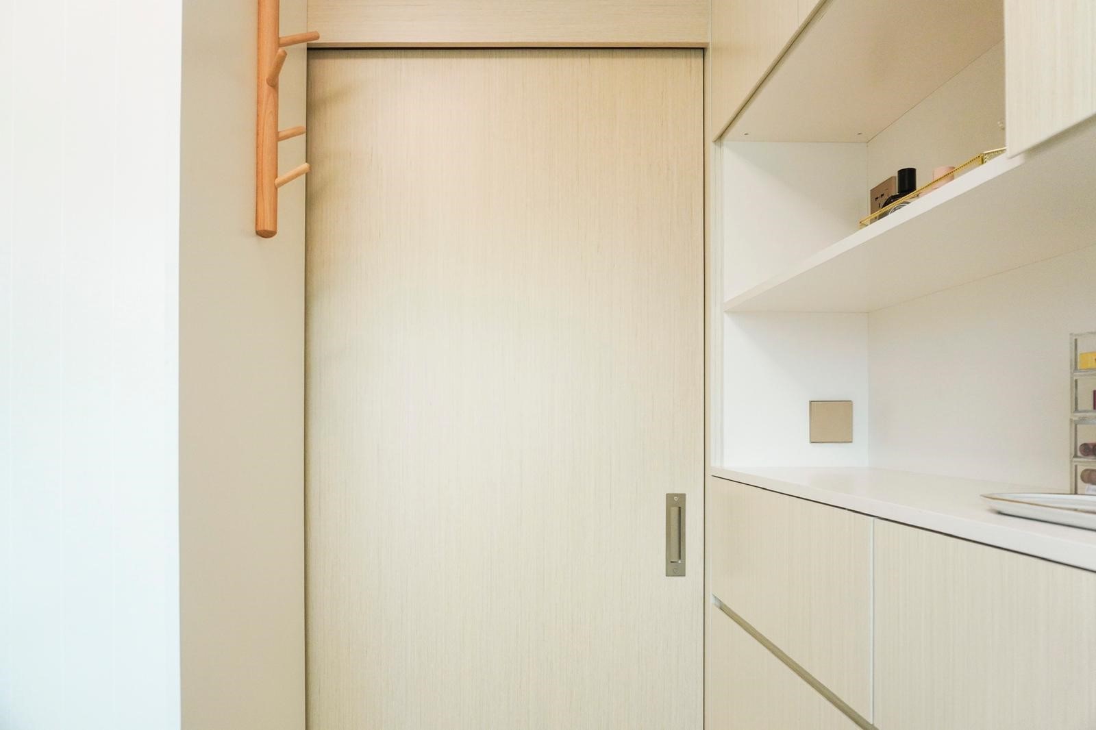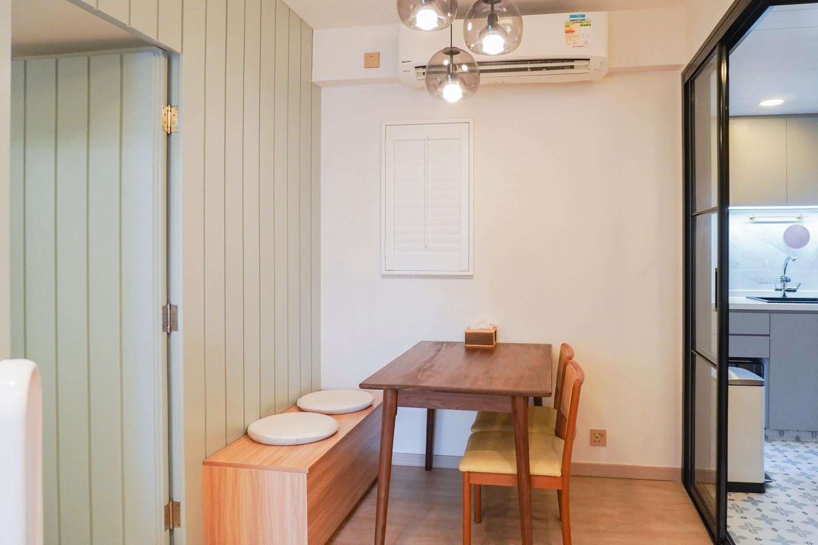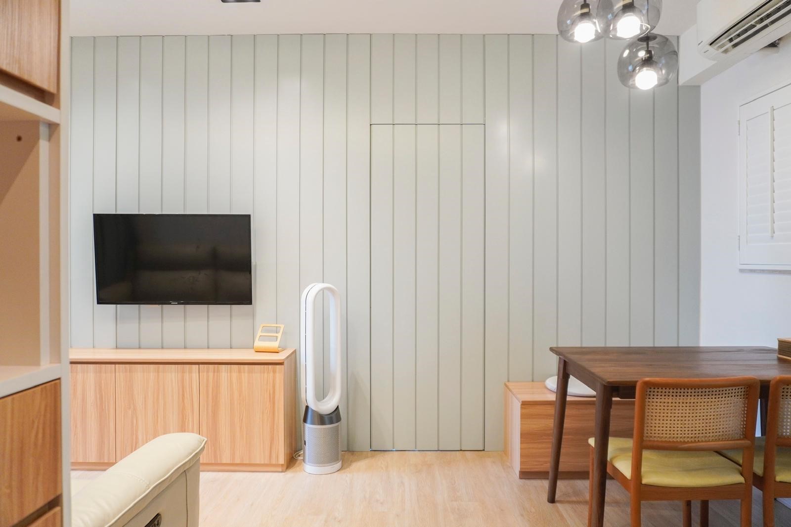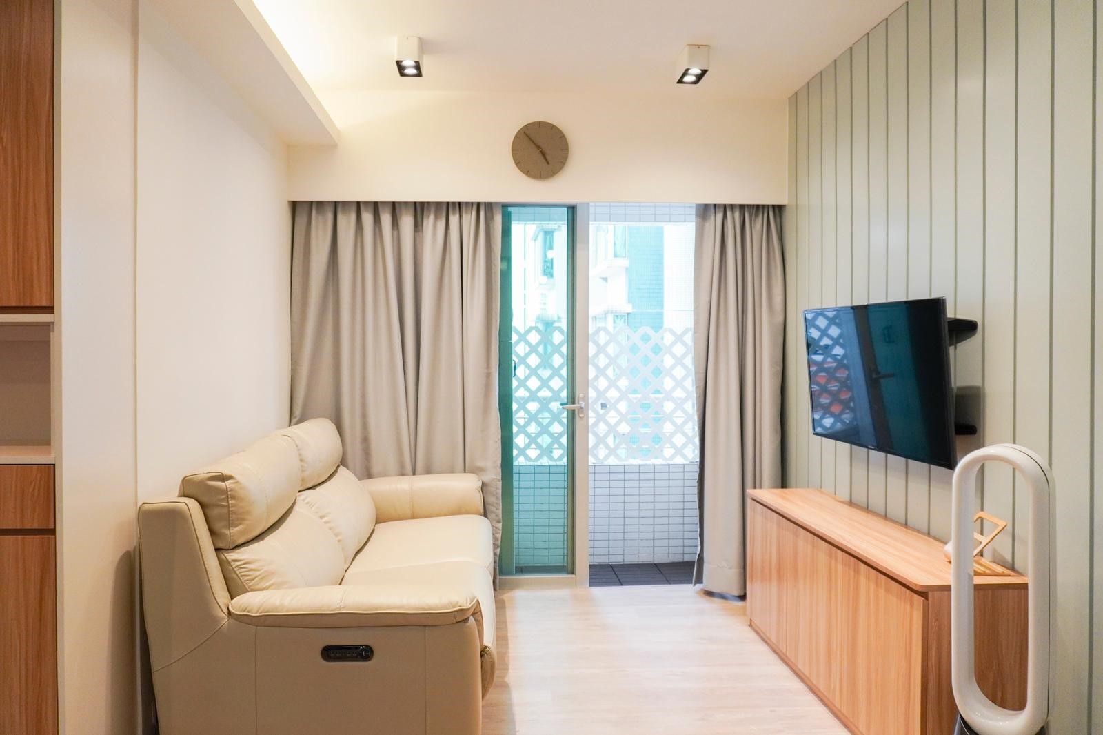 貫徹簡約「莫蘭迪」⾊系,選⽤近年⼤熱的⽜油果⾊,⼀幅過條紋牆⾝連暗⾨設計貫穿客飯廳,飯廳配襯歐式⽊系餐枱,柔和燈光點綴,營造舒適度假風。客廳沒有累贅的傢俬設計,透過簡約燈槽設計,營造燈光氛圍,令天花更有層次。