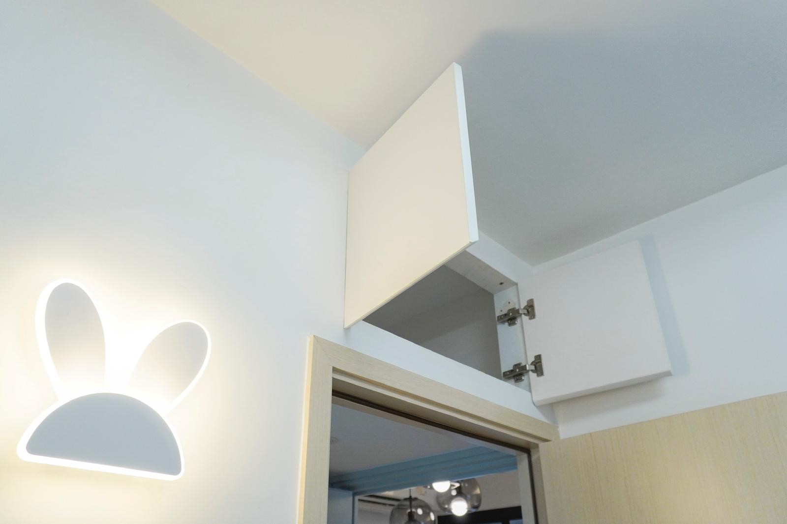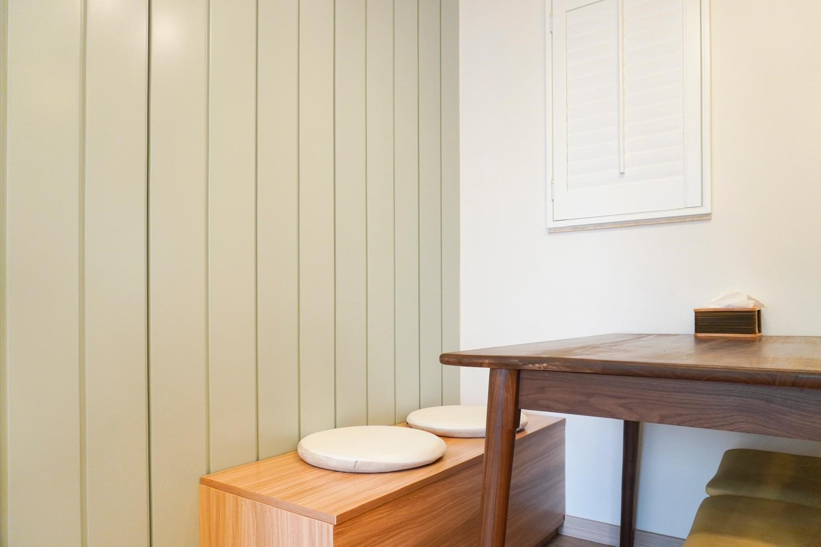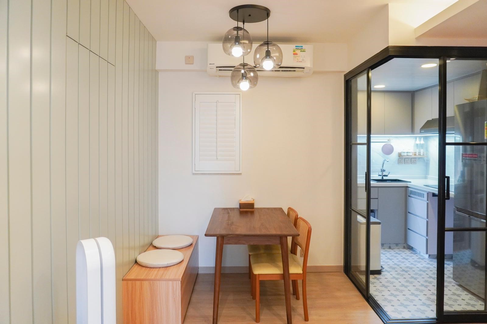貫徹簡約「莫蘭迪」⾊系,選⽤近年⼤熱的⽜油果⾊,⼀幅過條紋牆⾝連暗⾨設計貫穿客飯廳,飯廳配襯歐式⽊系餐枱,柔和燈光點綴,營造舒適度假風。客廳沒有累贅的傢俬設計,透過簡約燈槽設計,營造燈光氛圍,令天花更有層次。