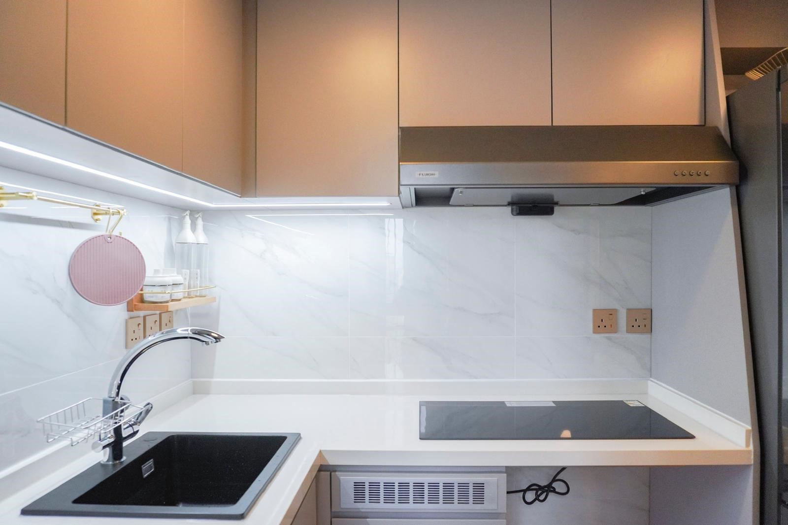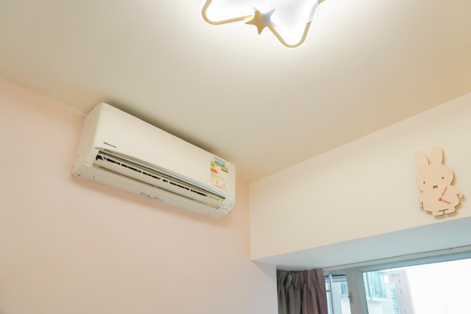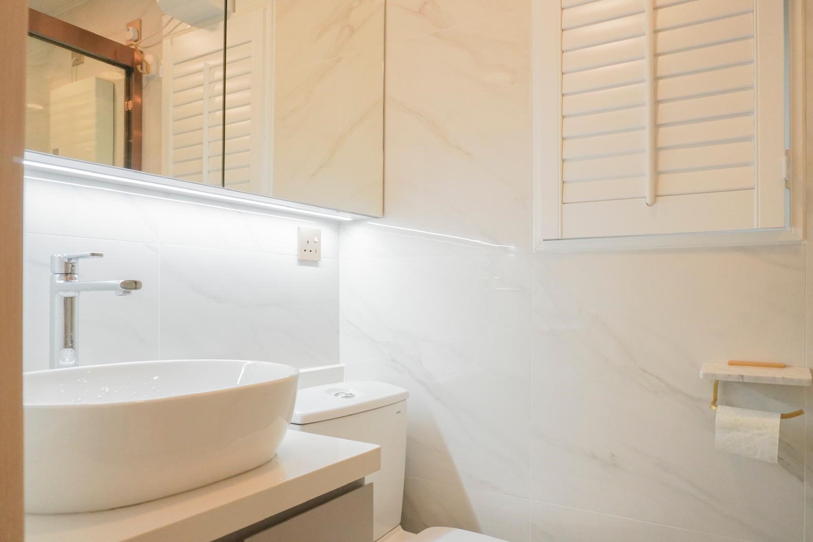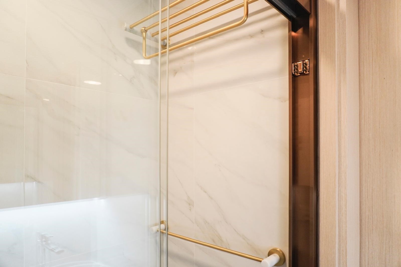 貫徹簡約「莫蘭迪」⾊系,選⽤近年⼤熱的⽜油果⾊,⼀幅過條紋牆⾝連暗⾨設計貫穿客飯廳,飯廳配襯歐式⽊系餐枱,柔和燈光點綴,營造舒適度假風。客廳沒有累贅的傢俬設計,透過簡約燈槽設計,營造燈光氛圍,令天花更有層次。
