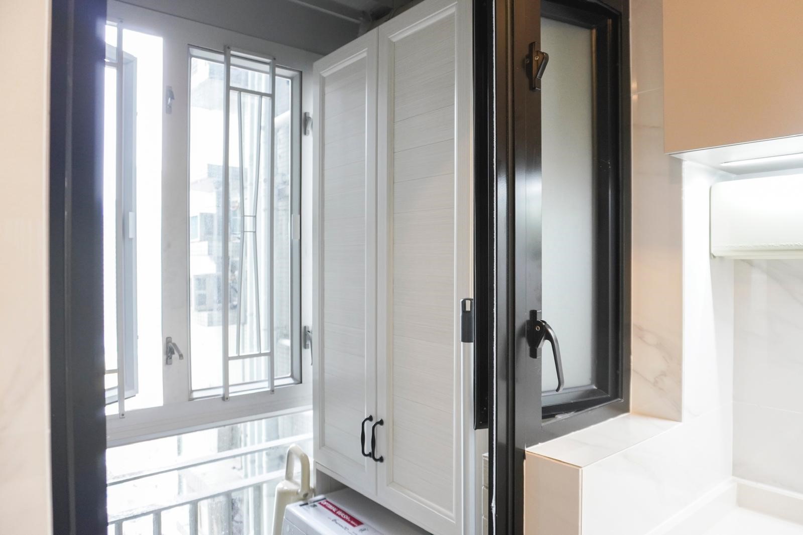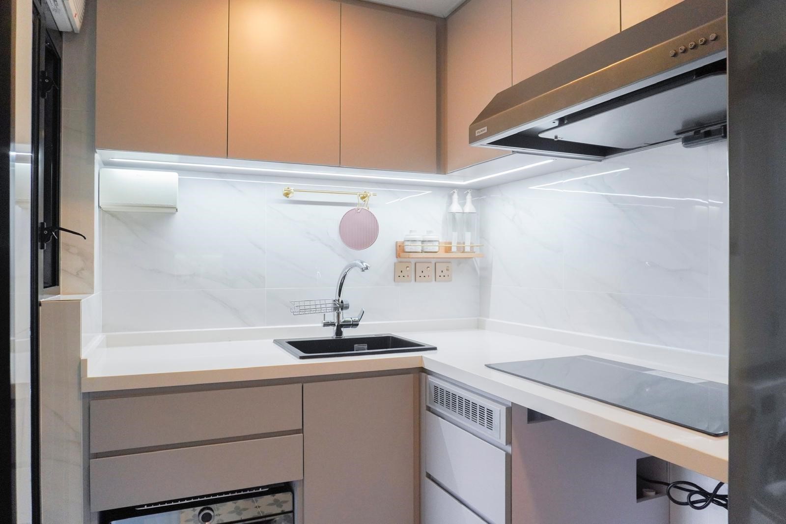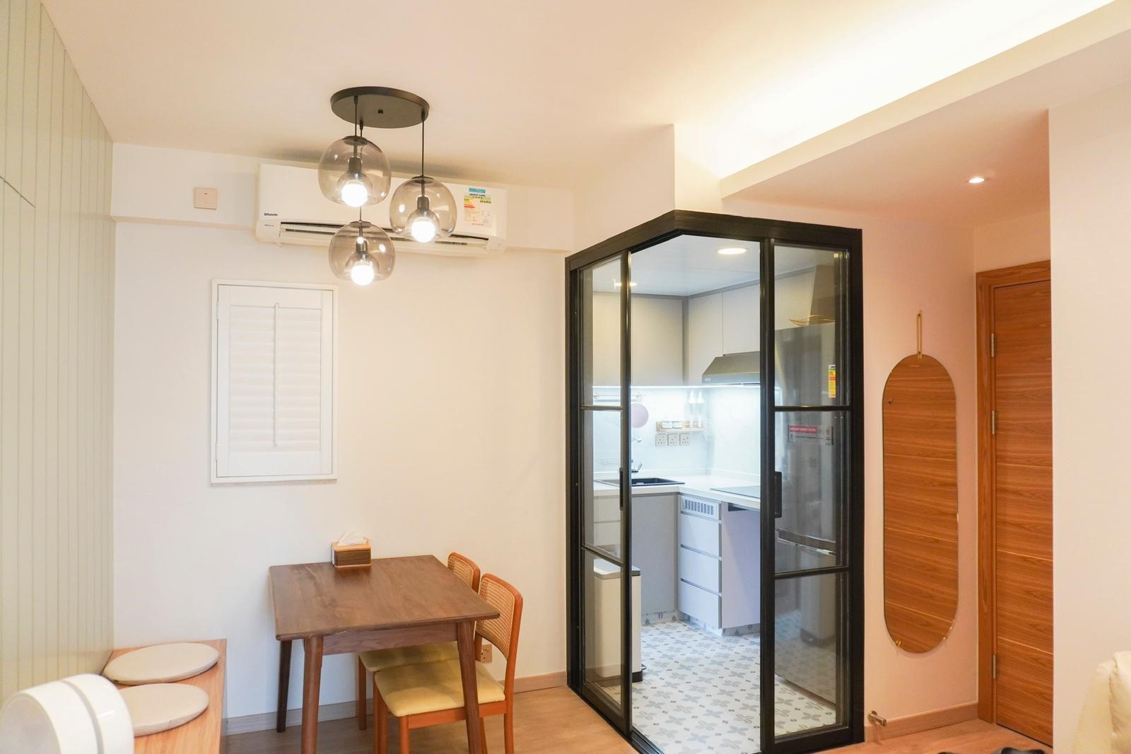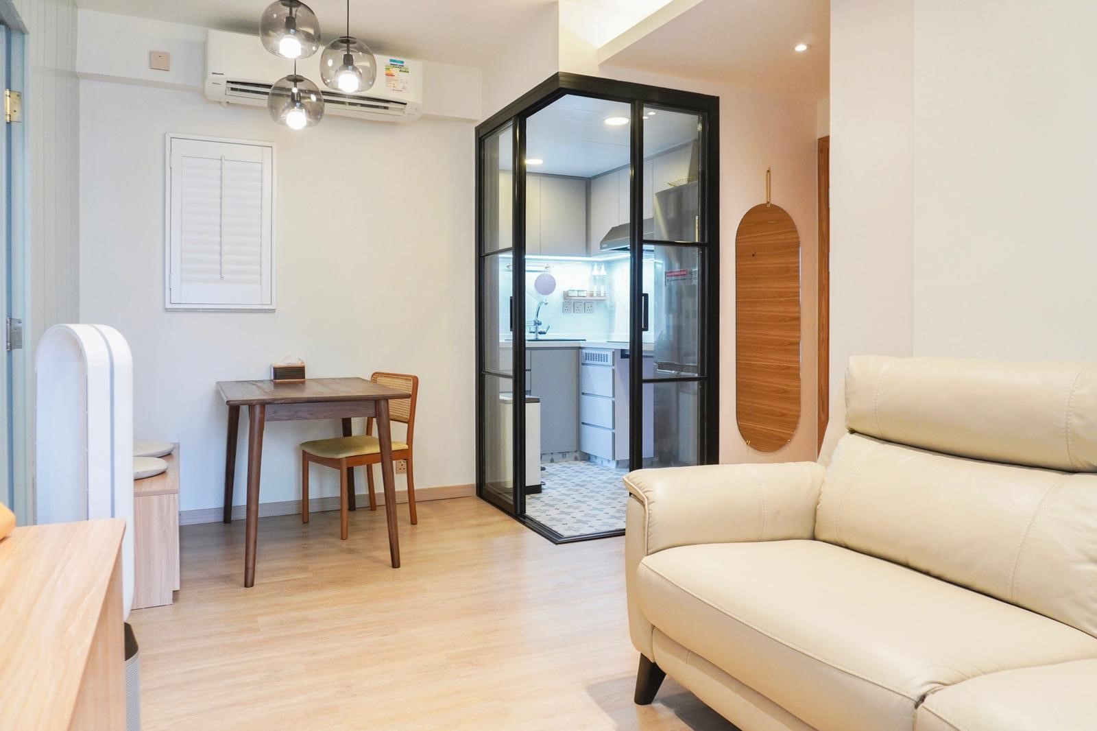 屋主最喜歡廚房位置及暗⾨牆⾝的設計,同時這兩項亦是今次的重點⼯程項⽬之⼀。廚房改為開放式設計,利⽤⿊框玻璃⾨分隔兩個空間,淺灰紫⾊廚櫃配襯⽩⾊淺紋瓷磚,效果簡潔舒服,地板和諧配搭特⾊花紋地磚,突顯濃厚歐陸家居風格。
