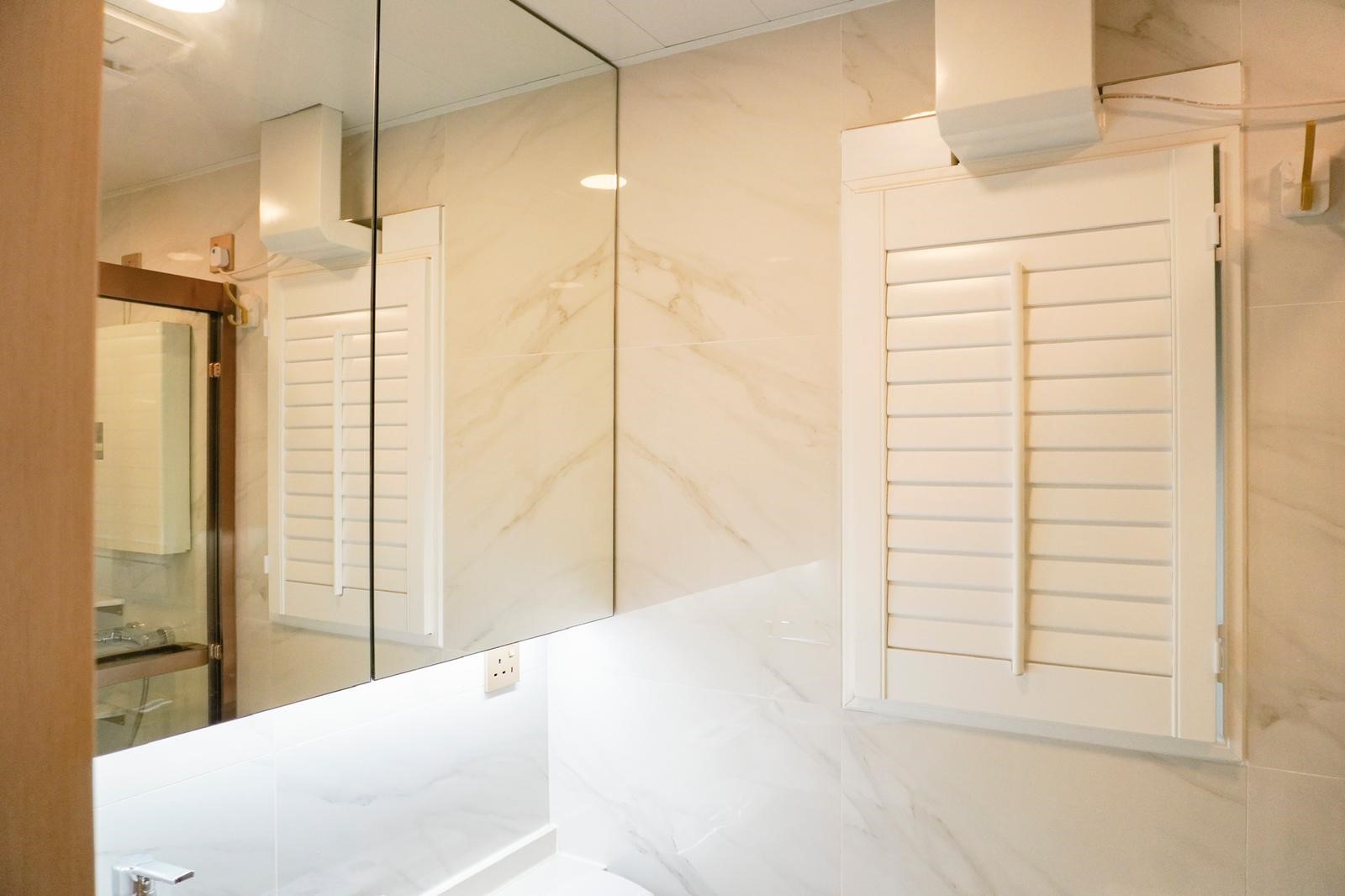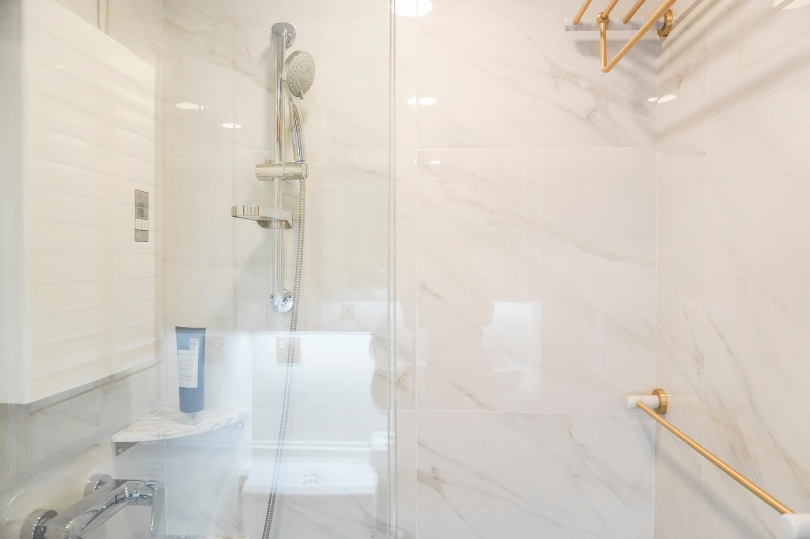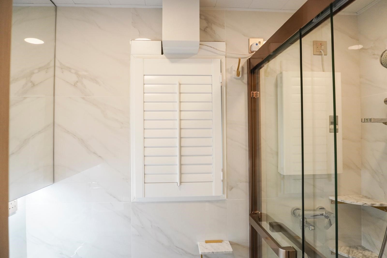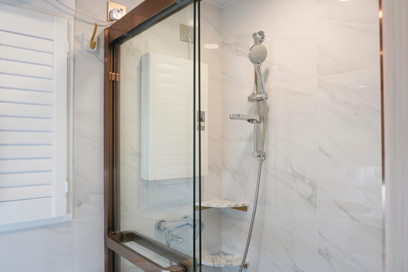 屋主最喜歡廚房位置及暗⾨牆⾝的設計,同時這兩項亦是今次的重點⼯程項⽬之⼀。廚房改為開放式設計,利⽤⿊框玻璃⾨分隔兩個空間,淺灰紫⾊廚櫃配襯⽩⾊淺紋瓷磚,效果簡潔舒服,地板和諧配搭特⾊花紋地磚,突顯濃厚歐陸家居風格。