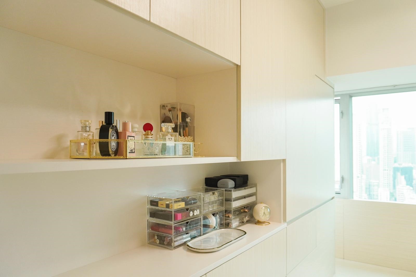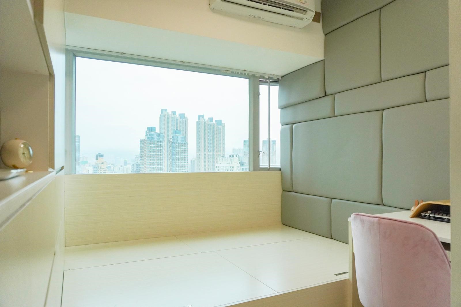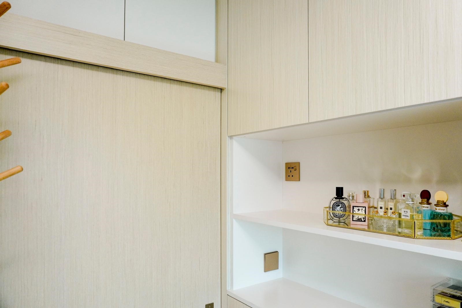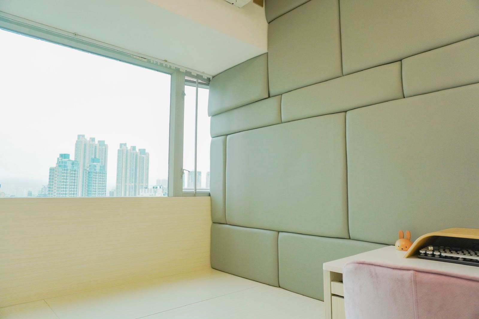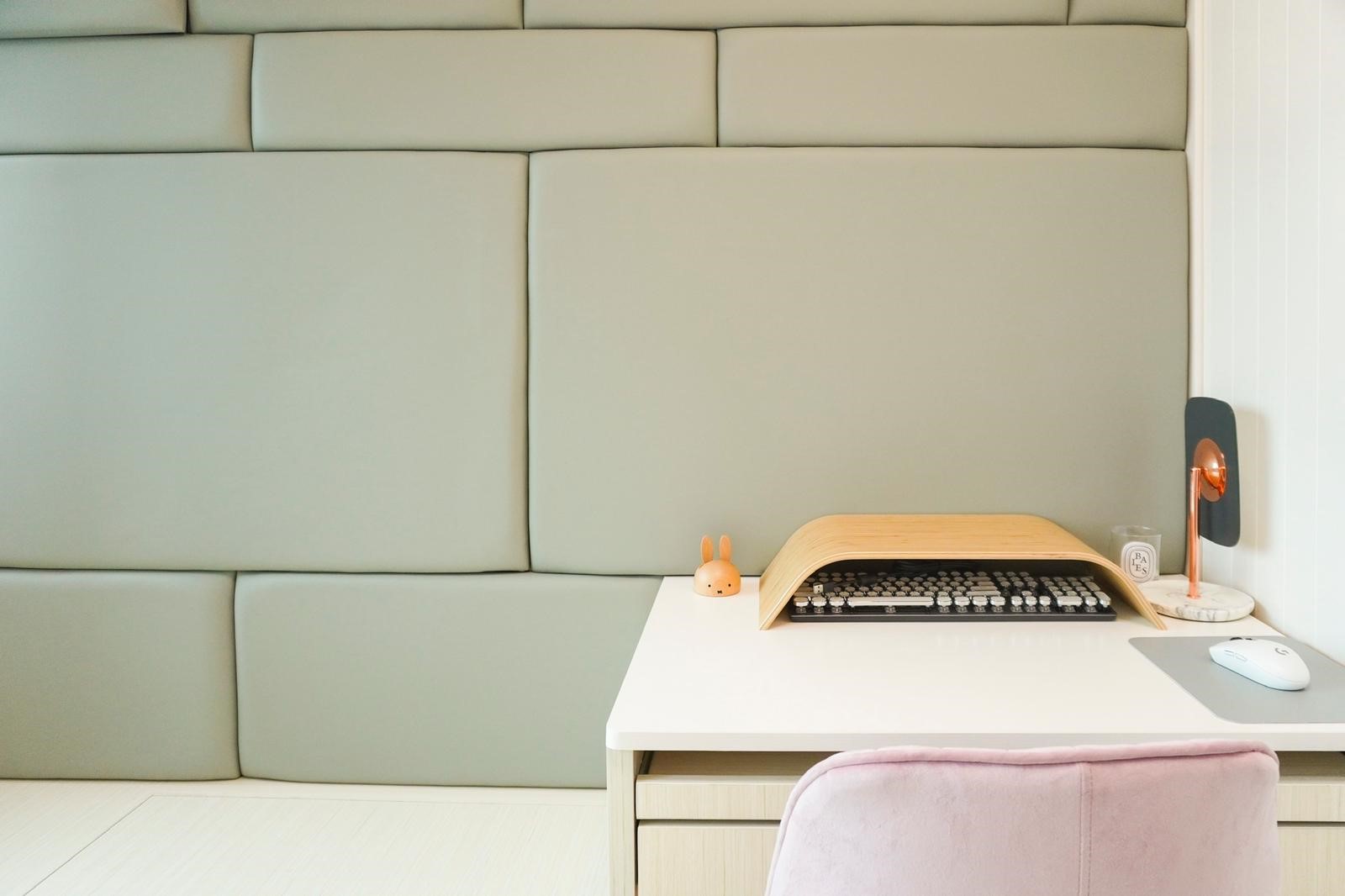 主⼈房的設計同樣別具⼼思,地台床⼀直延伸⾄窗台位置,利⽤騰出的空間設計成梳妝枱,同時為屋主訂製⼤量的收納櫃,顏⾊⽅⾯同樣以柔和淺⽊⾊系為主調,捨棄傳統床頭⽊板,選⽤⼀⼤幅⽜油果⾊牆⾝軟墊,整體感覺舒適療癒。