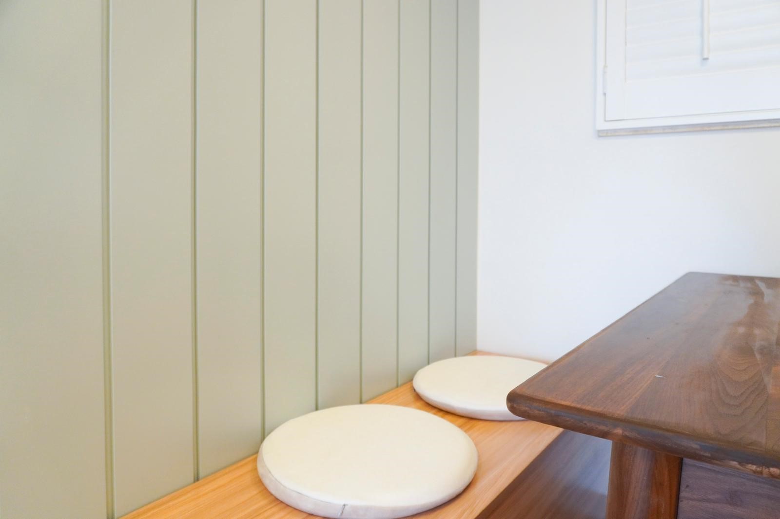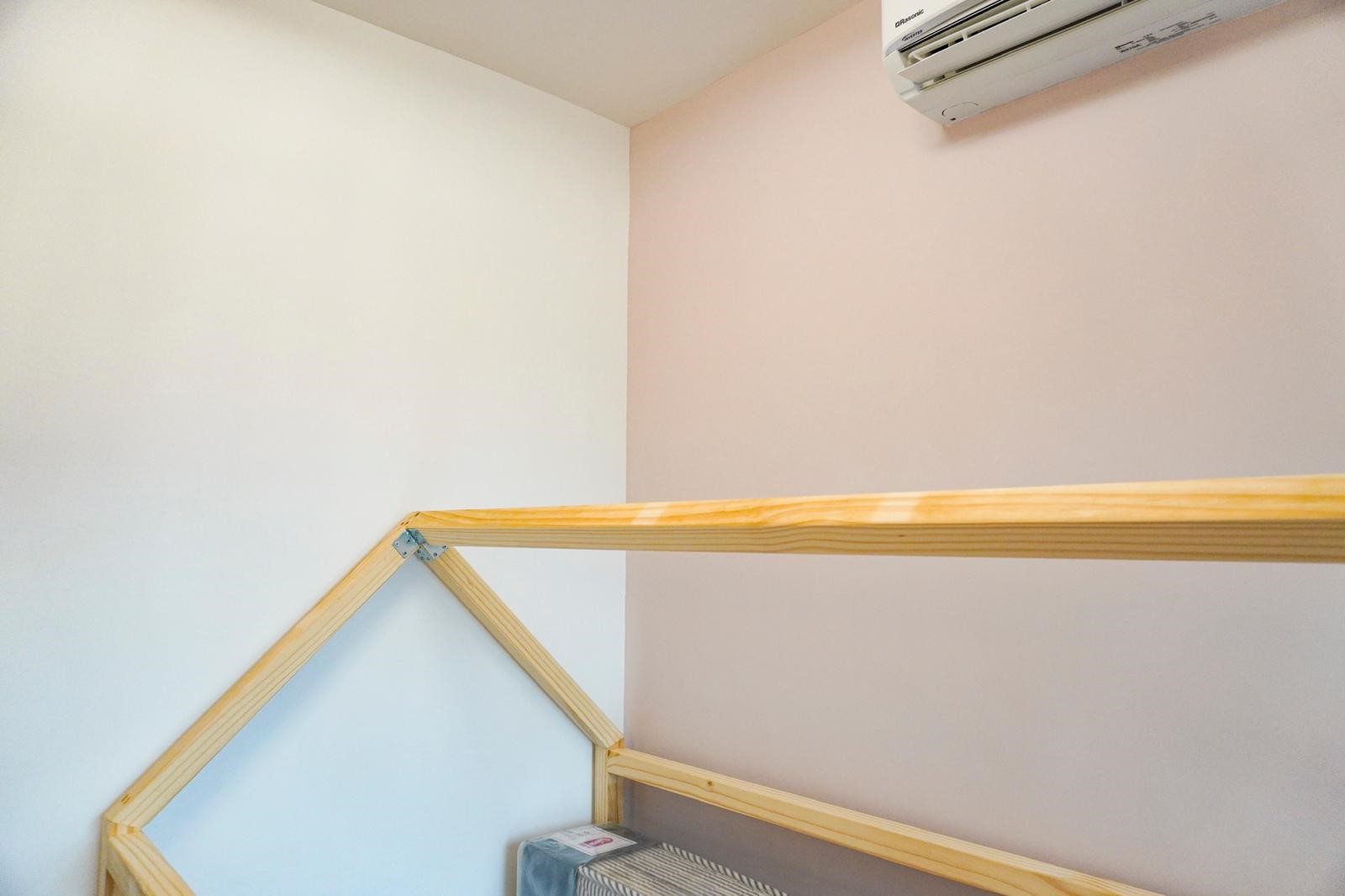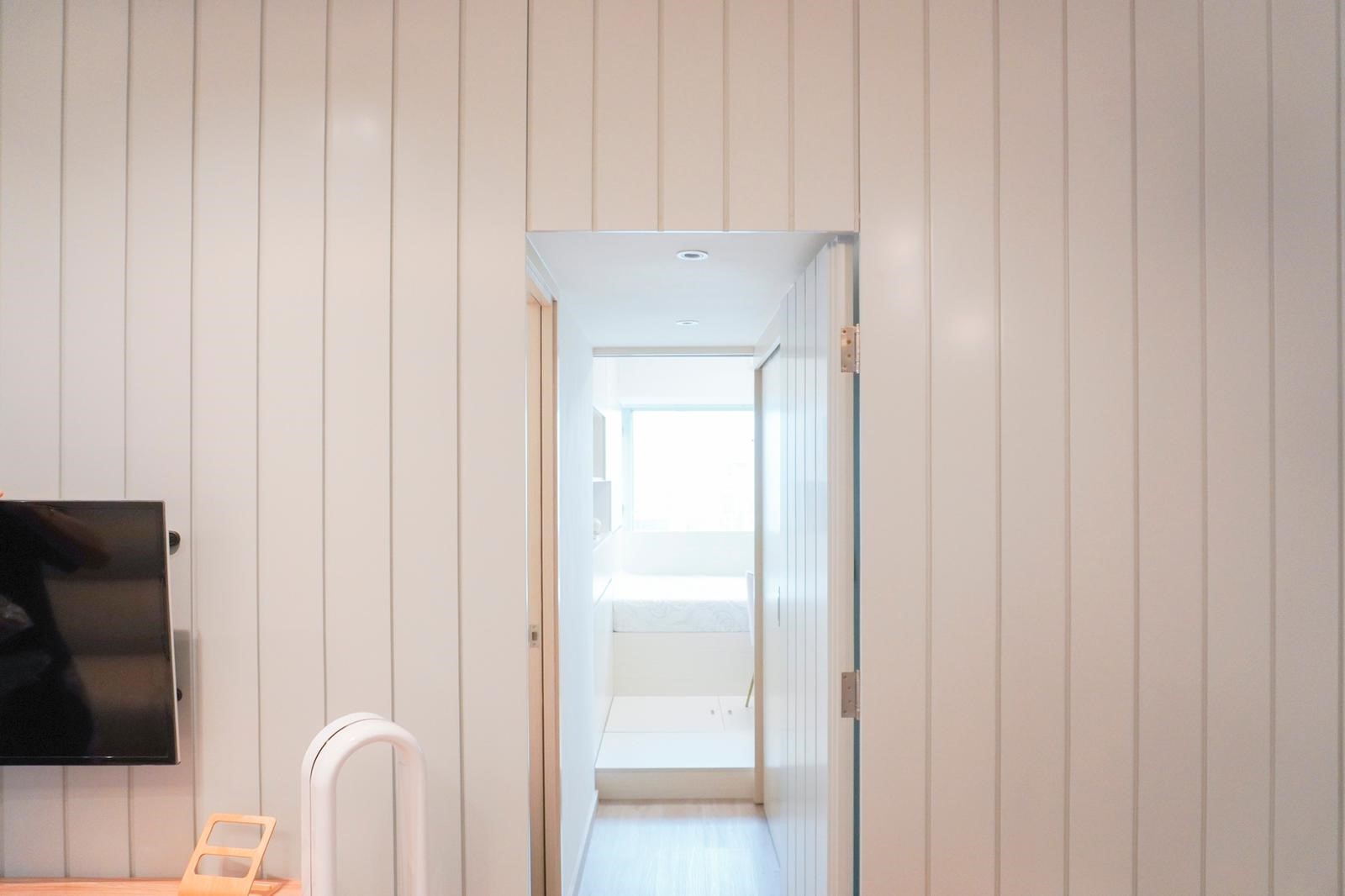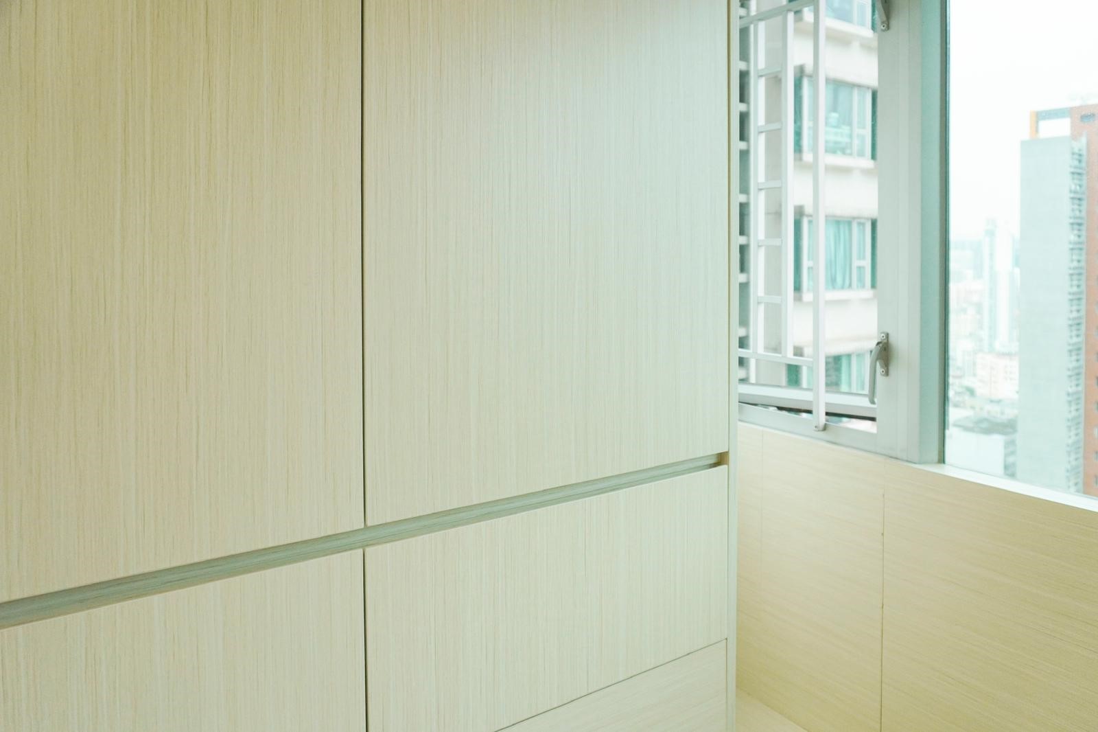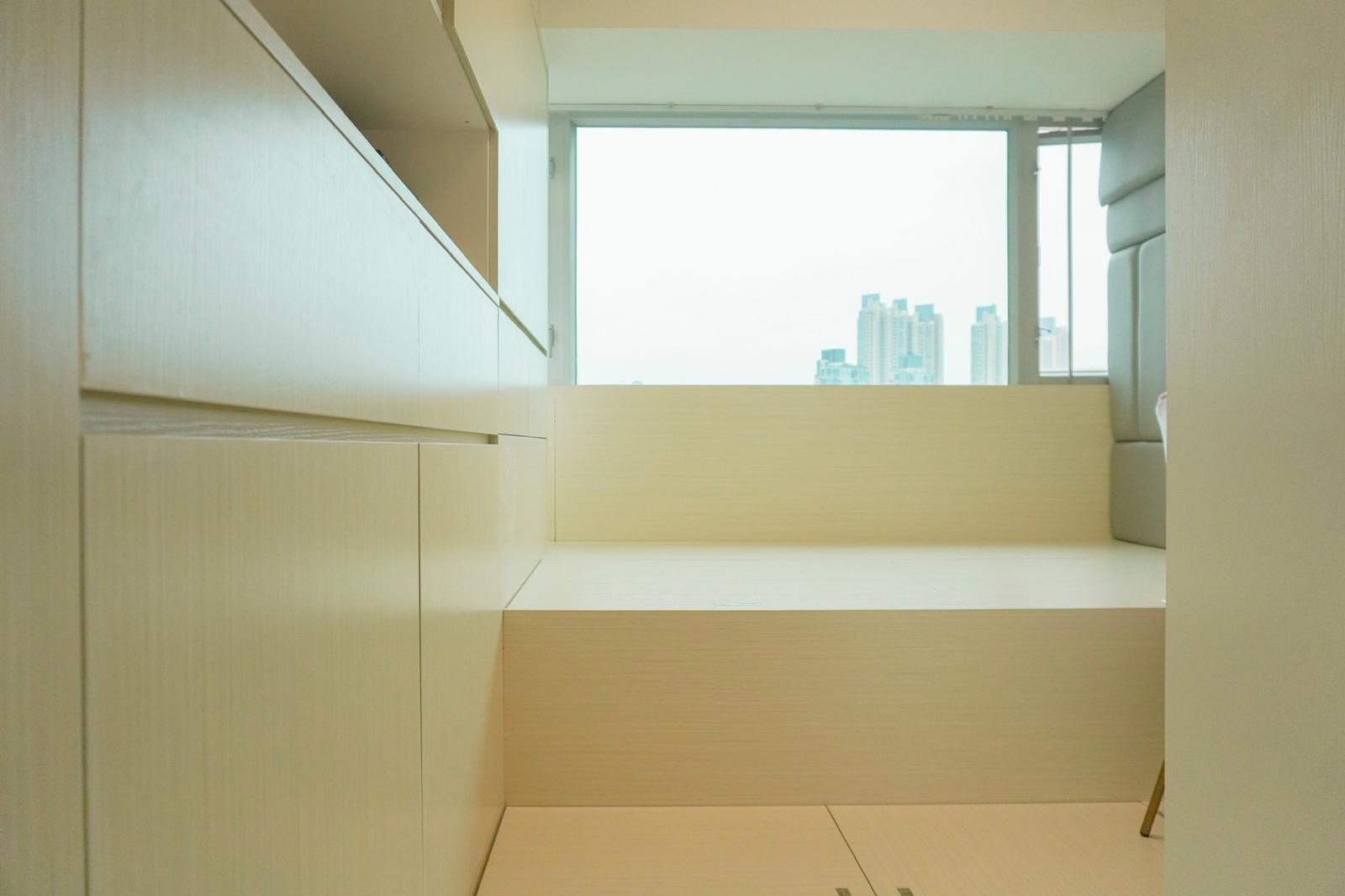 主⼈房的設計同樣別具⼼思,地台床⼀直延伸⾄窗台位置,利⽤騰出的空間設計成梳妝枱,同時為屋主訂製⼤量的收納櫃,顏⾊⽅⾯同樣以柔和淺⽊⾊系為主調,捨棄傳統床頭⽊板,選⽤⼀⼤幅⽜油果⾊牆⾝軟墊,整體感覺舒適療癒。